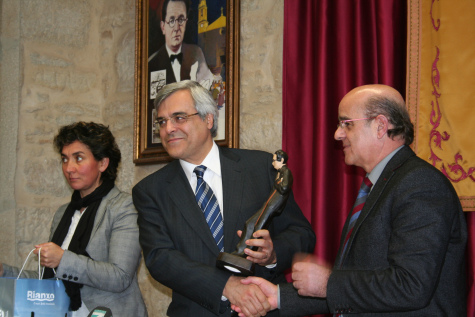 Carlos Reis recebe uma figurinha de Castelao de mãos de Pedro Piñeiro