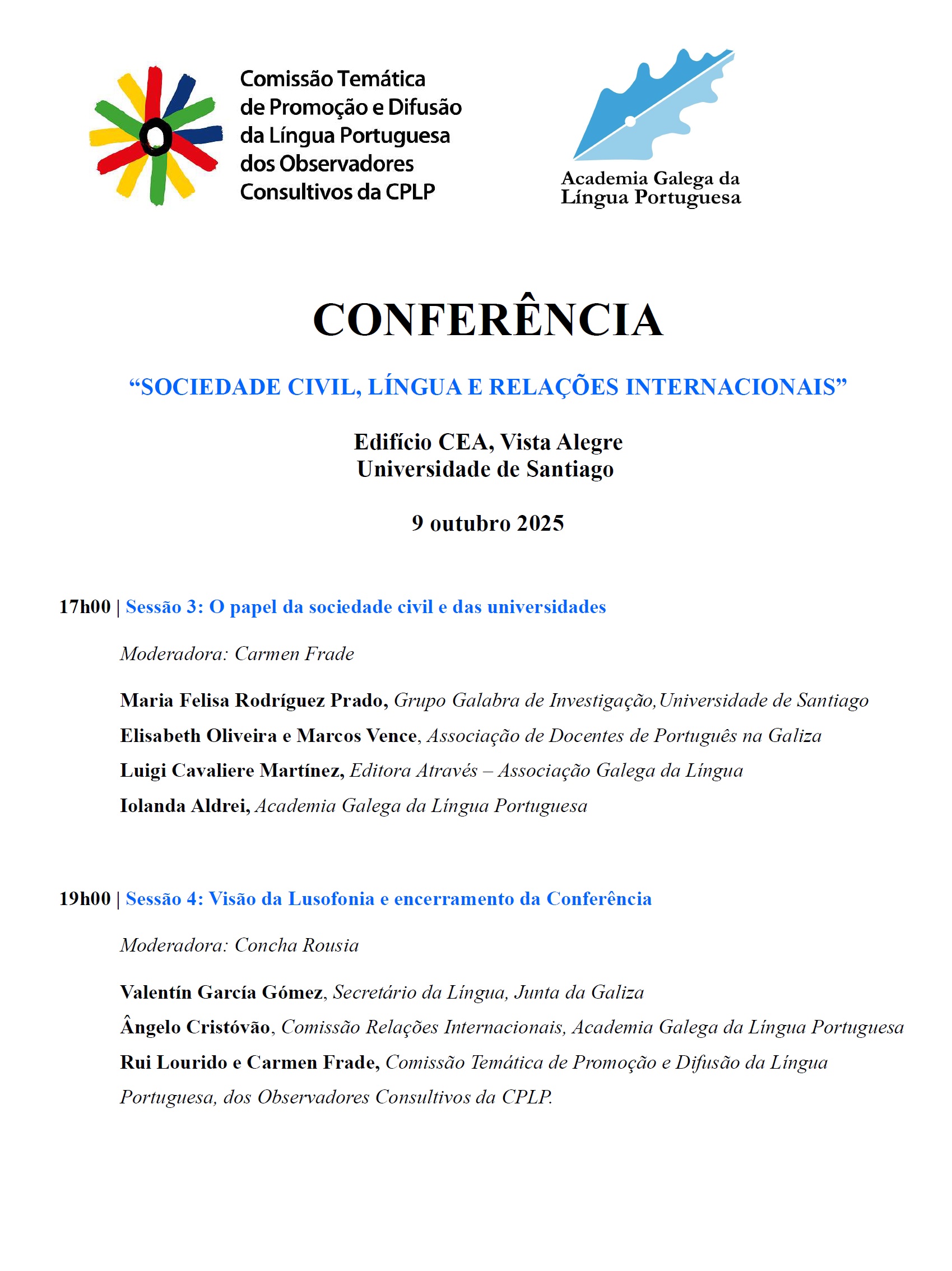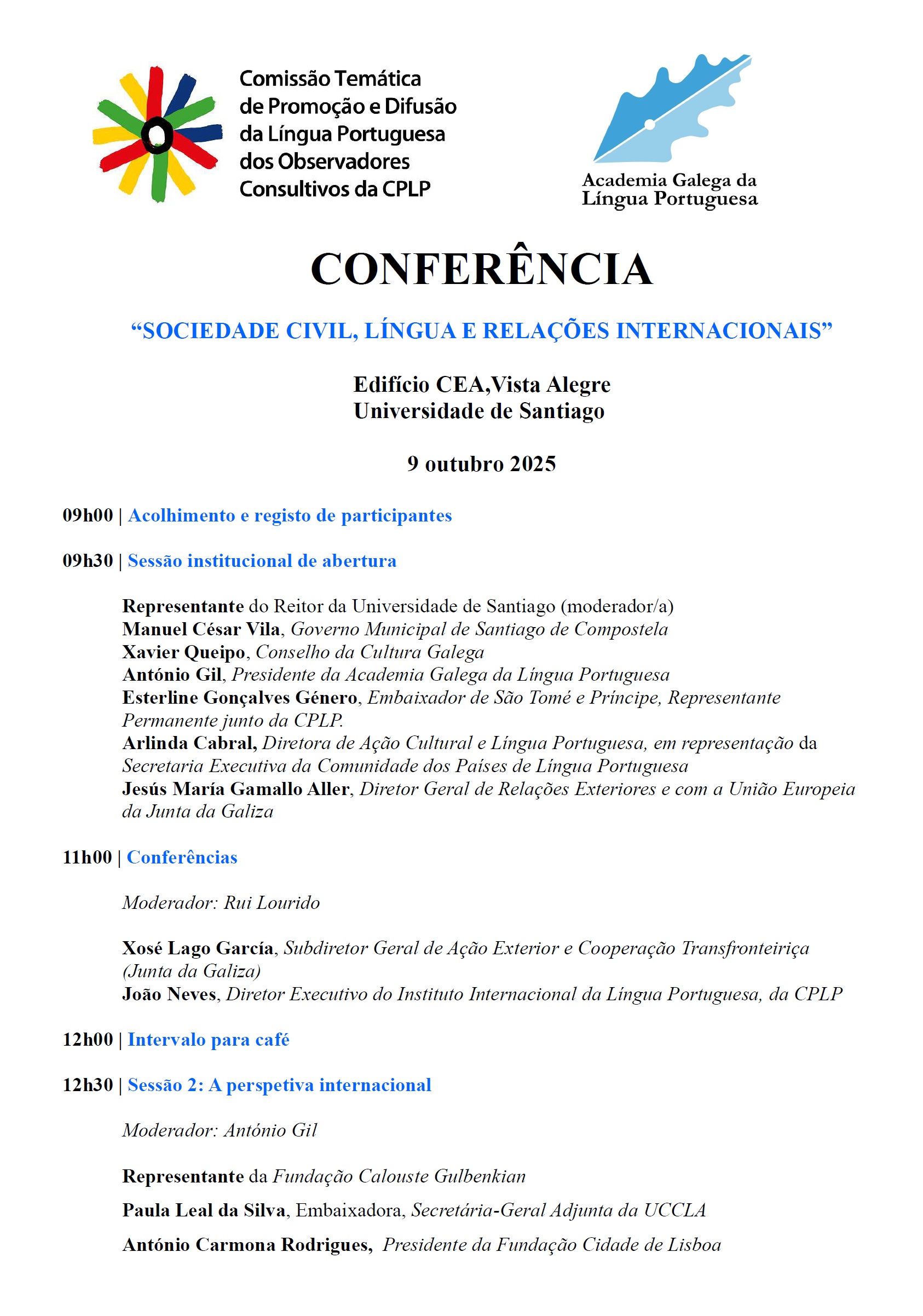 A Comissão Temática de Promoção e Difusão da Língua Portuguesa, dos Observadores Consultivos da CPLP, e a Academia Galega da Língua Portuguesa, entidade integrada nesta Comissão, organizam uma conferência sob o título “SOCIEDADE CIVIL, LÍNGUA E RELAÇÕES INTERNACIONAIS”, que terá lugar o dia 9 de outubro de 2025, no edifício CIE (Vista Alegre), em Santiago de Compostela.