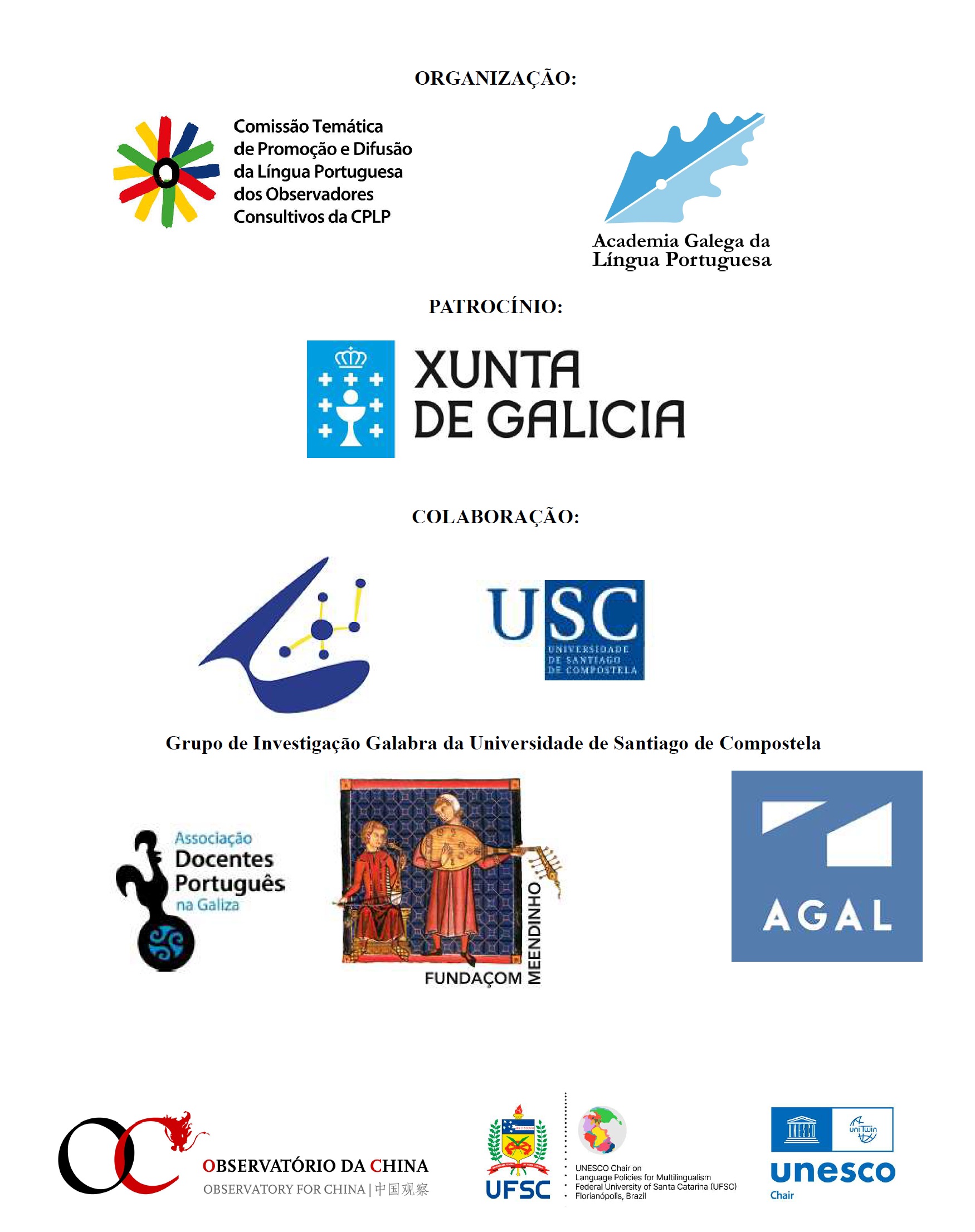 O evento, de entrada livre, realiza-se em dependências da Universidade de Santiago, como principal instituição colaboradora. Conta também com o apoio da Associação de Docentes de Português na Galiza, a AGAL, a Fundação Meendinho, o Grupo Galabra de Investigação, o Observatório da China e a Cátedra Unesco em Políticas Linguísticas para o Multilinguismo.